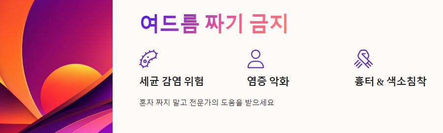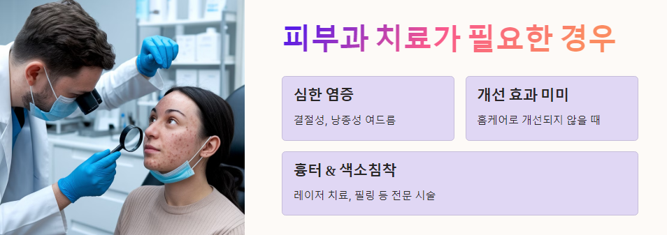 집에서 꾸준히 관리해도 차도가 없거나 증상이 심한 경우에는 🙅♀️ 혼자 끙끙 앓지 말고 ✔️ 피부과 전문의와 상담하여 적절한 치료를 받는 것이 중요합니다.