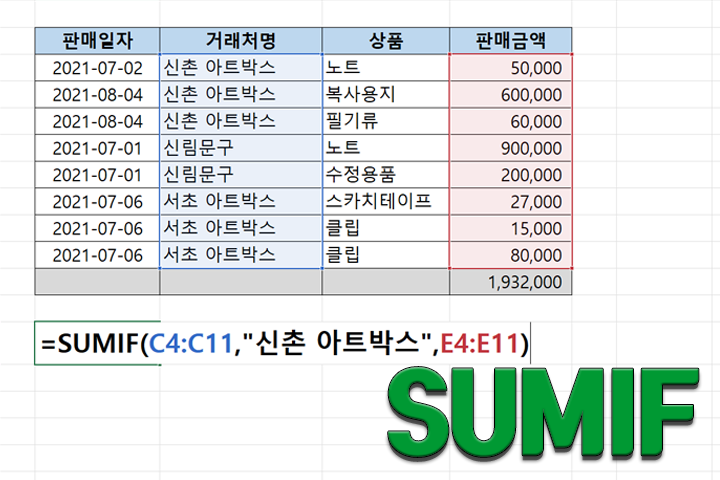 이 수식은 B2:B5 범위에서 "신촌 아트박스"라는 조건을 만족하는 D2:D5 범위의 값을 합산해요. 결과적으로 1,932,000이 나오게 되죠.