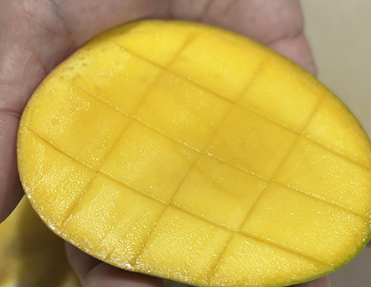 • 애플망고를 세로로 놓고 납작한 면을 찾아주세요. 애플망고는 납작한 씨를 중심으로 양 옆으로 과육이 붙어 있어요. 납작한 면이 씨앗이 있는 부분입니다.
