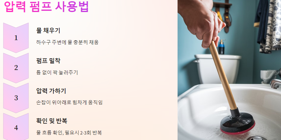 ✔️ 꿀팁: 압력 펌프 사용 시 하수구 주변에 수건이나 비닐 등을 덮어주면 물이 튀는 것을 방지할 수 있습니다. 변기에 사용하는 뚫어뻥과 싱크대, 세면대에 사용하는 뚫어뻥은 모양이 다르니 용도에 맞는 제품을 사용하세요.