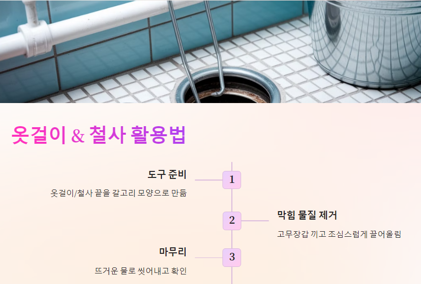 ✔️ 꿀팁: 옷걸이나 철사가 너무 굵으면 하수구 안에서 걸릴 수 있으니, 적당한 굵기의 도구를 사용하는 것이 중요합니다. 무리하게 힘을 주면 하수구나 배관이 손상될 수 있으니 주의하세요.