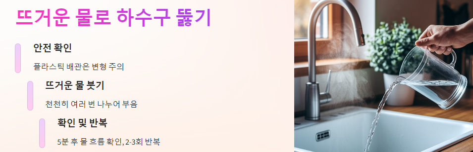 - 하수구 주변에 뜨거운 물을 부어도 안전한지 확인하세요. (플라스틱 배관은 변형될 수 있으니 주의!)