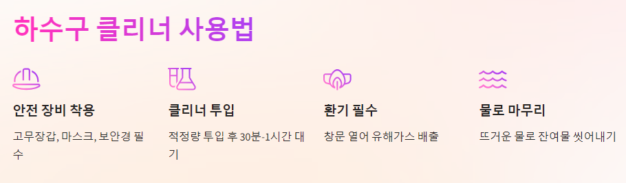 - 준비물: 하수구 클리너 (액체 또는 가루), 고무장갑, 마스크, 보안경 (선택 사항)