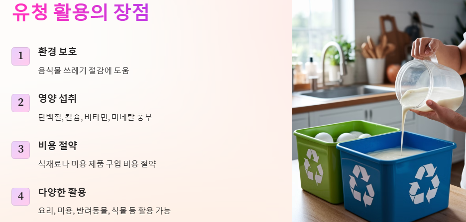 • 알뜰한 생활: 유청을 활용하면 식재료나 미용 제품 구입 비용을 절약할 수 있어요. 공짜로 얻어지는 유청으로 다양한 가치를 창출해 보세요! 💰