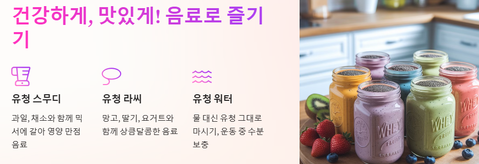 • 유청 스무디: 과일, 채소, 요거트 등과 함께 믹서에 갈아 스무디로 즐겨보세요. 단백질과 비타민을 한 번에 섭취할 수 있는 영양 만점 음료가 완성됩니다. 아침 식사 대용이나 운동 후 마시면 더욱 좋아요!
