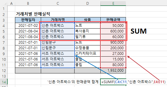 이 수식은 B2:B5 범위에서 "신촌 아트박스"라는 조건을 만족하는 D2:D5 범위의 값을 합산해요. 결과적으로 1,932,000이 나오게 되죠.
