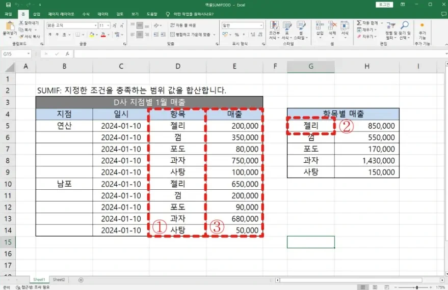 =SUMIF(C2:C5, "젤리", D2:D5)