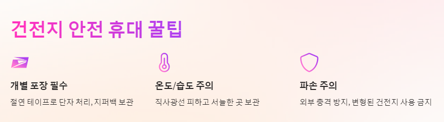 - 기타 건전지 (알카라인, 망간, 니켈수소, 니켈카드뮴): 일반 건전지는 구입 시 포장을 그대로 유지하거나, 비닐 봉투, 지퍼백, 건전지 케이스 등을 이용하여 개별 포장하면 됩니다. 건전지 케이스는 다이소나 온라인 쇼핑몰에서 저렴하게 구입할 수 있습니다. 📦