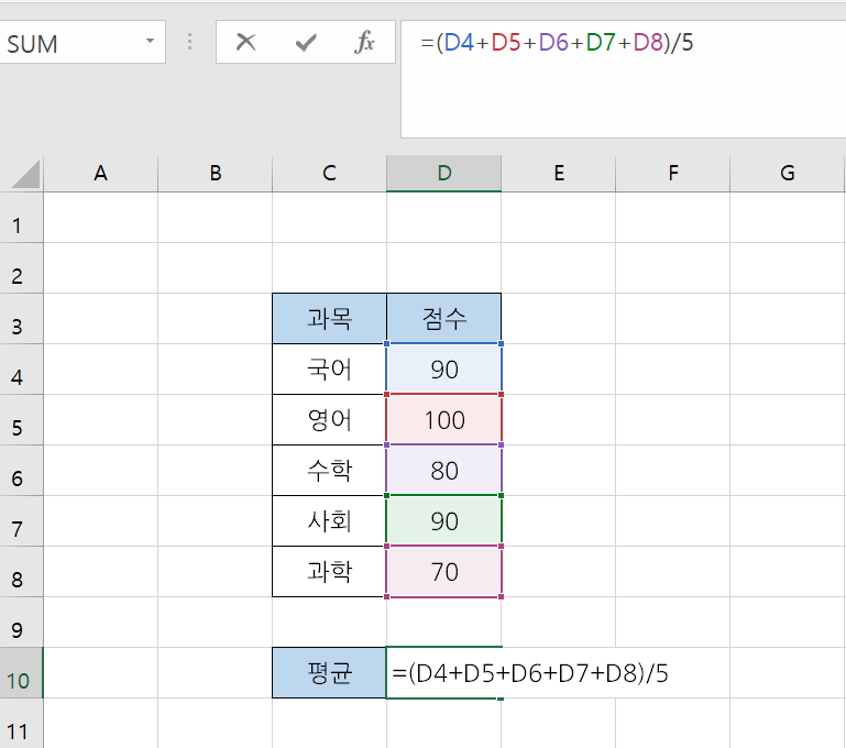 이 표에서는 각 과목의 점수가 나열되어 있고, 마지막 행에는 평균 점수를 계산하는 수식이 포함되어 있습니다. =(D4+D5+D6+D7+D8)/5와 같은 수식을 사용하여 평균을 구할 수 있어요. 이 방법은 간단하지만, AVERAGE 함수를 사용하면 더 효율적으로 평균을 계산할 수 있습니다.