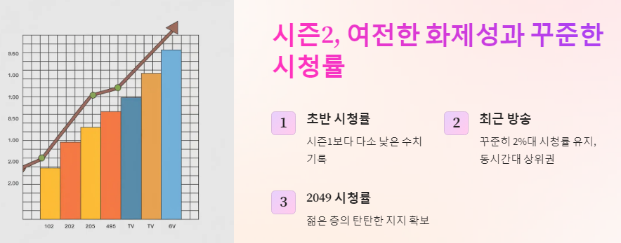 - 시즌2의 정확한 최고 시청률 수치는 현재까지 공식적으로 발표되지 않았습니다. 최근 2%대 시청률 유지를 기록하고 있다는 기사들을 참고하여 표기하였습니다.