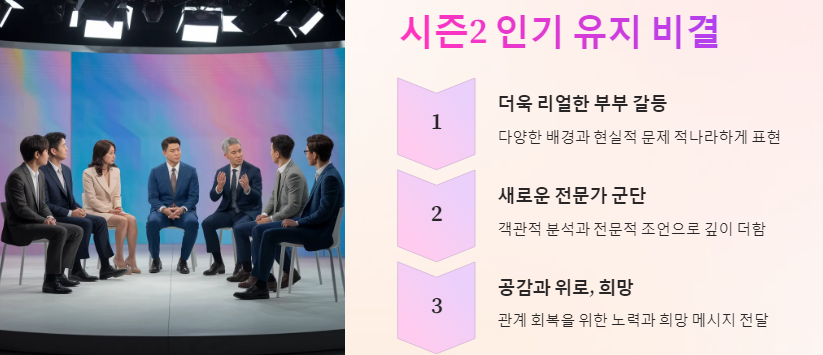 이혼숙려캠프 시즌2 가 시즌1에 이어 꾸준히 인기를 유지하는 비결은 무엇일까요? 시즌2만의 차별화된 매력과 시청 포인트를 분석해 보겠습니다.