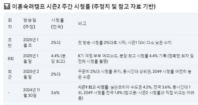 이혼숙려캠프 시즌2 는 현재 꾸준히 2%대 시청률을 유지하며 안정적인 인기를 확보하고 있습니다. 앞으로 남은 방송을 통해 시청률 상승을 기대해 볼 수 있을까요? 시청률 전망과 기대 요인을 분석해 보겠습니다.