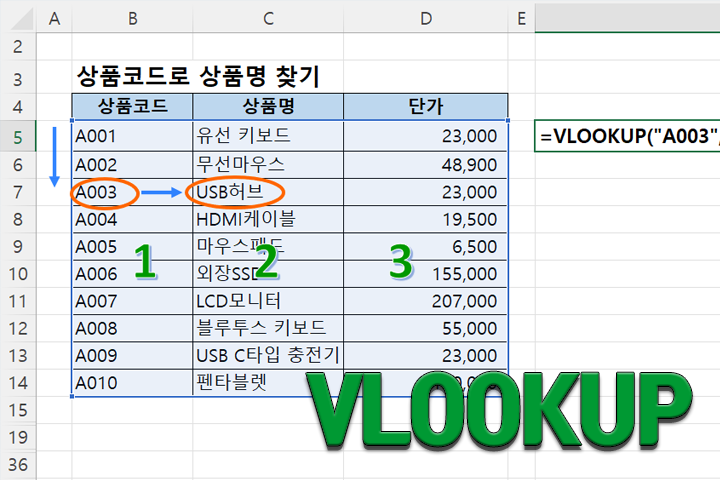 =VLOOKUP("A003", A1:C5, 2, FALSE) // 제품 이름 =VLOOKUP("A003", A1:C5, 3, FALSE) // 가격