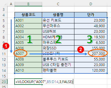 이렇게 하면 각각 "USB허브"와 "23,000"이라는 결과를 얻을 수 있어요. 또 다른 예시로, 제품 코드 "A007"에 대한 가격을 찾는 경우도 살펴볼게요.