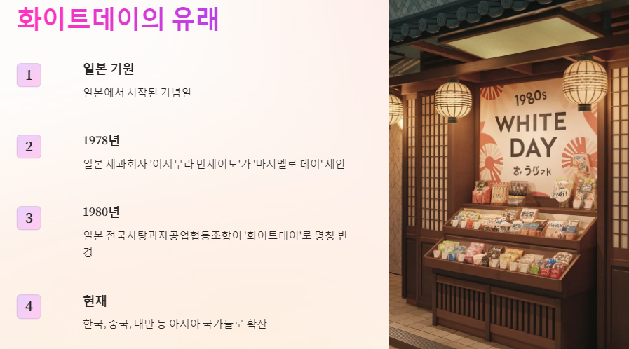 • 1980년 일본 전국사탕과자공업협동조합: 마시멜로 대신 사탕을 선물하는 '화이트데이'로 명칭을 변경하고, 3월 14일로 날짜를 정하여 본격적인 마케팅을 시작했습니다. '화이트'라는 이름은 '순수하고 깨끗한 사랑'을 의미하며, 사탕의 흰색에서 유래되었다고 합니다.