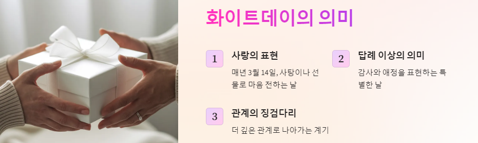 화이트데이는 단순히 사탕을 주고받는 날을 넘어, 사랑하는 마음을 표현하고 서로의 관계를 더욱 돈독하게 만들어주는 소중한 기념일입니다. 이번 블로그 글에서는 화이트데이의 의미와 유래부터 센스 있는 선물 추천, 그리고 로맨틱한 화이트데이를 위한 완벽 가이드까지! 화이트데이에 대한 모든 궁금증을 해결하고, 사랑하는 사람에게 잊지 못할 달콤한 하루를 선물해 보세요!