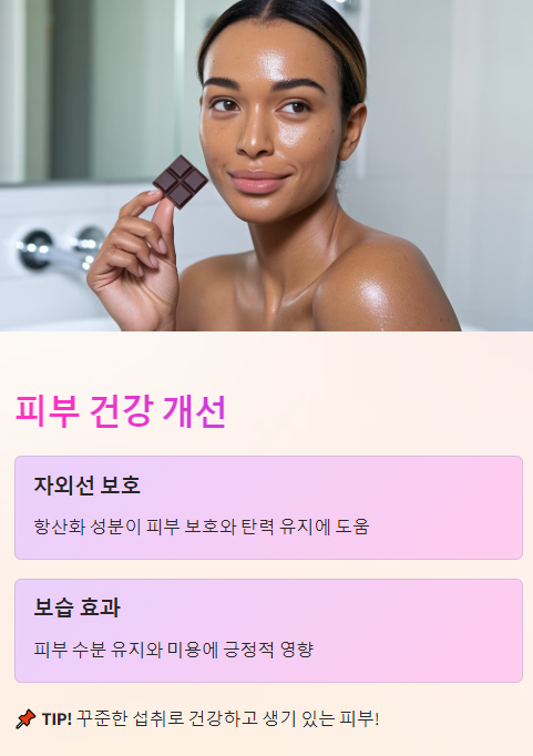 ✅ 다크 초콜릿의 항산화 성분은 자외선으로부터 피부를 보호하고 탄력을 유지하는 데 도움을 줄 수 있다.