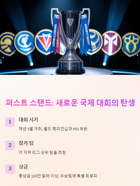 라이엇 게임즈는 LoL e스포츠의 글로벌 경쟁력을 강화하고자 **'퍼스트 스탠드'**라는 새로운 국제 대회를 도입했습니다. 이 대회는 기존의 월드 챔피언십과 미드 시즌 인비테이셔널(MSI)을 보완하며, 매년 3월에 개최될 예정입니다.