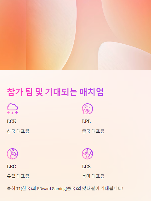 이번 대회에는 LCK(한국), LPL(중국), LEC(유럽), LCS(북미) 등 주요 지역 리그의 상위 팀들이 참가합니다. 특히, T1(한국)과 EDward Gaming(중국)의 맞대결이 팬들의 큰 기대를 모으고 있습니다.