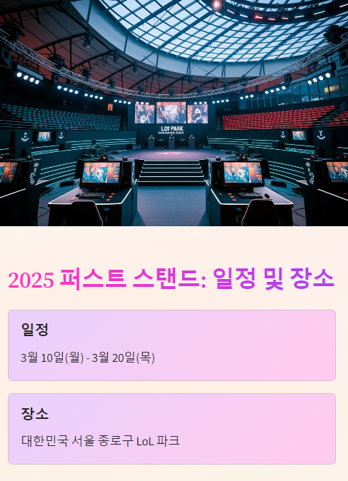 2025년 퍼스트 스탠드는 3월 10일(월)부터 - 3월 20일(목)까지 진행되며, 대한민국 서울 종로구에 위치한 LoL 파크에서 개최됩니다. 이곳은 최신 시설과 최고의 관람 환경을 갖춘 e스포츠 전용 경기장으로, 팬들에게 잊지 못할 경험을 선사할 것입니다.