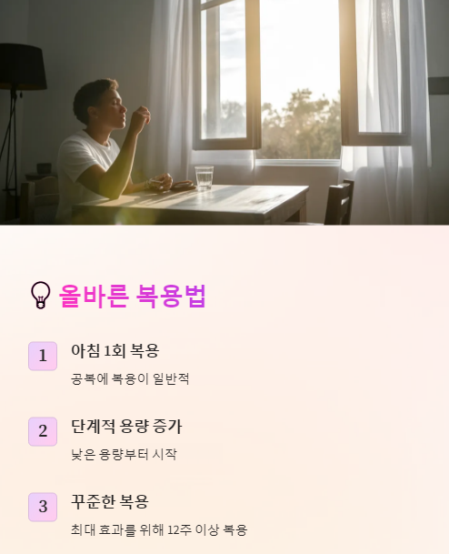 - 매일 아침 1회 복용 (공복에 복용이 일반적)