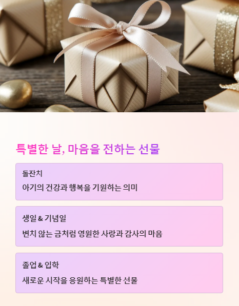 - 돌잔치: 아기의 첫 생일을 축하하는 의미로 순금 콩알금은 인기 만점 선물입니다. 아기의 건강과 행복을 기원하는 마음을 담아 특별한 선물을 해보세요.