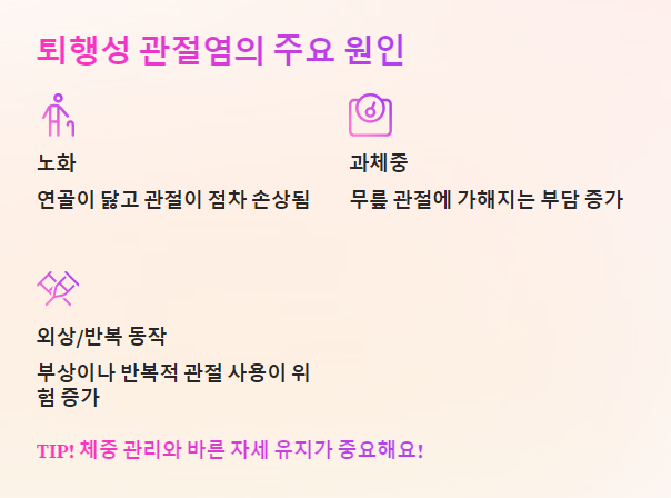 특히 비만과 잘못된 자세는 관절 부담을 크게 늘리는 원인이므로, 체중 관리와 바른 자세 유지가 중요해요!