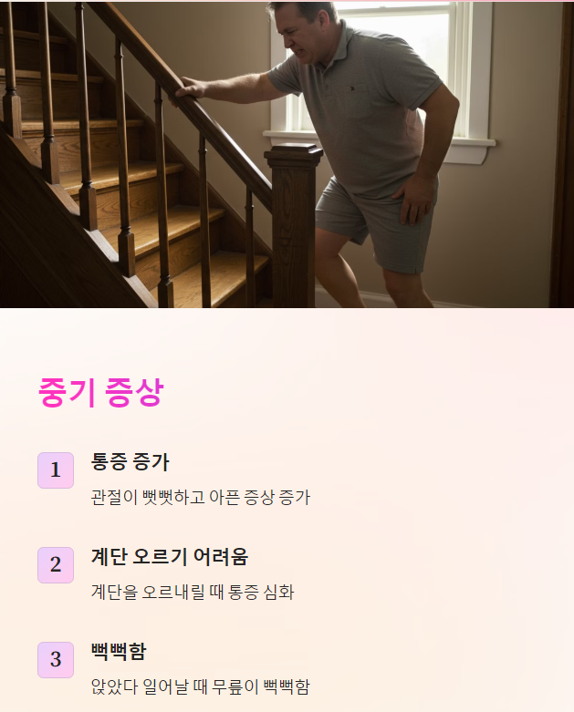 ✔ 말기에는 인공관절 수술이 필요할 수도 있음