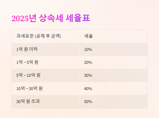 ✔ 상속세율은 과세표준(공제 후 금액)에 따라 10~50% 차등 적용