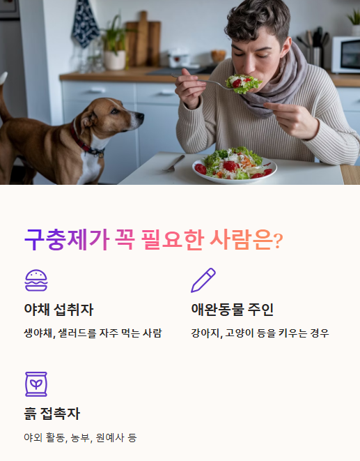 ✔ 특히 야채를 많이 먹거나, 애완동물을 키우는 경우 구충제 복용이 더 중요!
