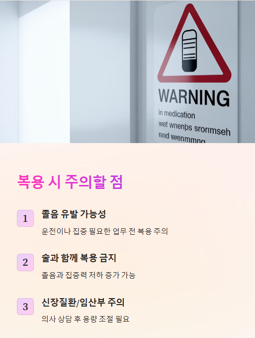 ✔ 졸음 & 집중력 저하 가능성 있으므로 운전 전 복용 주의!