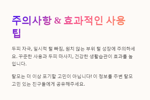 - 일시적인 털 빠짐 증가 (쉐딩 현상): 초기 사용 시 일시적으로 털 빠짐이 증가하는 현상이 나타날 수 있지만, 이는 새로운 모발이 자라나기 위한 과정일 수 있습니다.
