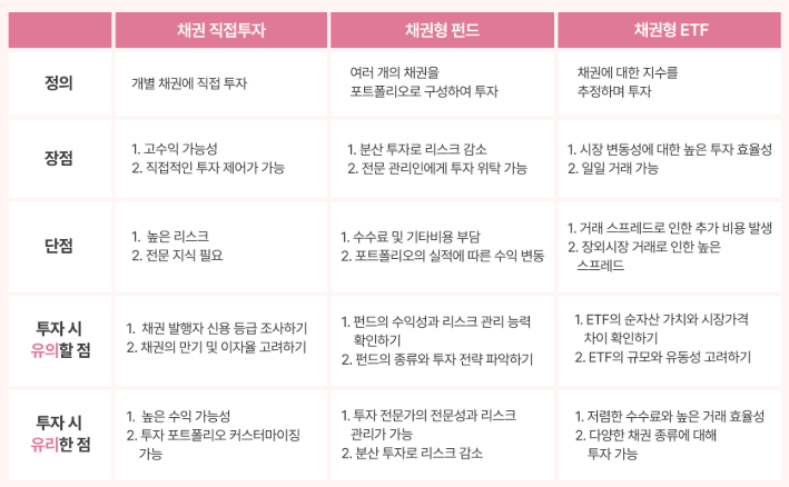 - 직접 채권 투자 : 높은 수익을 기대할 수 있지만, 리스크도 큽니다.