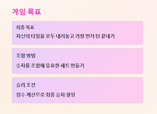 ✔ 숫자 타일을 조합하여 점수를 쌓고 먼저 패를 없애는 보드게임