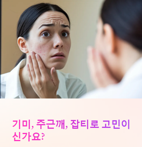 • 기미 (Melasma): 주로 여성에게 나타나는 갈색 또는 암갈색의 불규칙한 반점