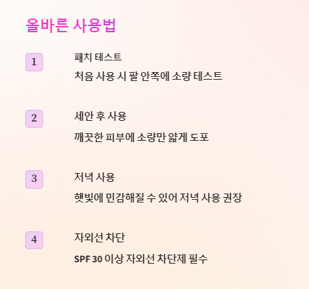• 다른 미백 제품과 병용 주의: 다른 미백 성분이 함유된 제품과 함께 사용하는 것은 피부 자극을 유발할 수 있으므로 주의해야 합니다.