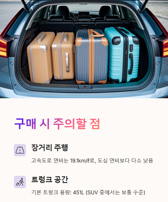 ✔ 기본 트렁크 용량: 451L (SUV 중에서는 보통 수준)