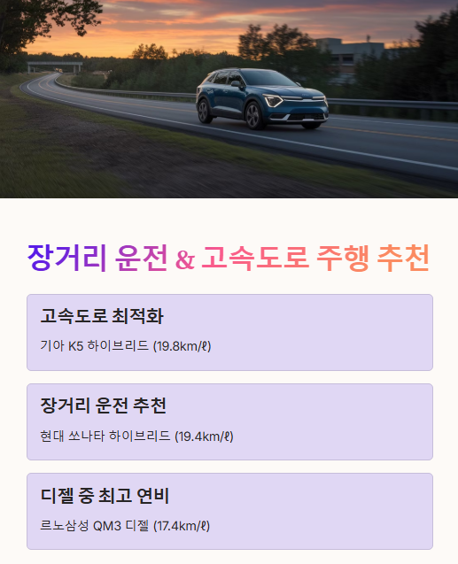 ✔ 고속도로 최적화 모델: 기아 K5 하이브리드 (19.8km/ℓ)