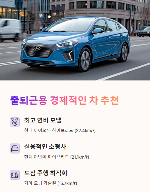 ✔ 출퇴근 & 경제성 → 현대 아이오닉 하이브리드, 기아 모닝