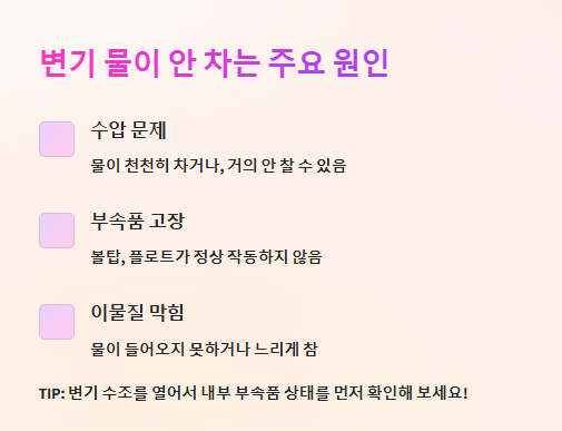 ✔ 부속품(볼탑, 플로트) 고장 → 물을 채우는 장치가 정상 작동하지 않음