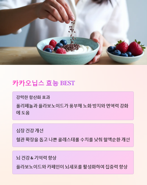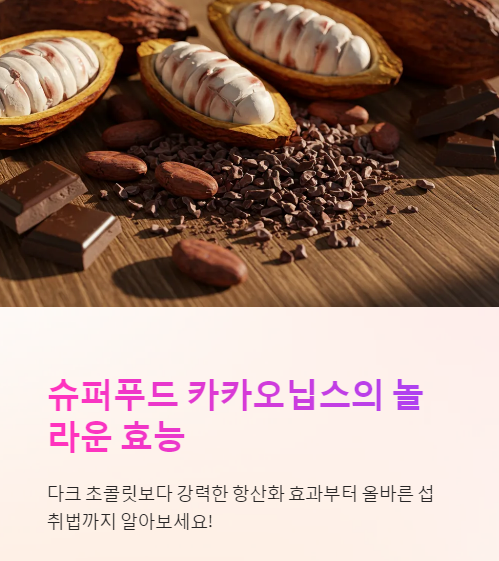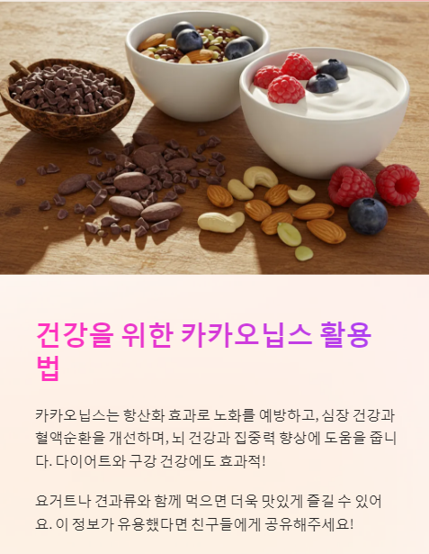 👉 "건강한 혈관과 심장을 위해! 하루 5~10g 정도 카카오닙스를 섭취해보세요!"