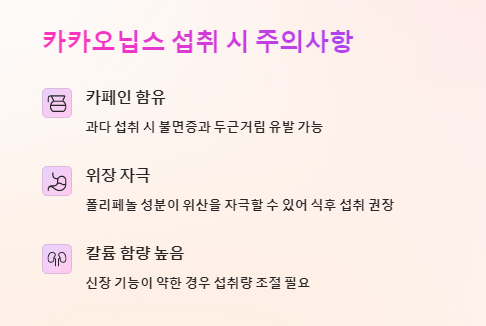 ✔ 카카오닙스의 폴리페놀 성분이 위산을 자극할 수 있어, 위염 & 속쓰림 주의!