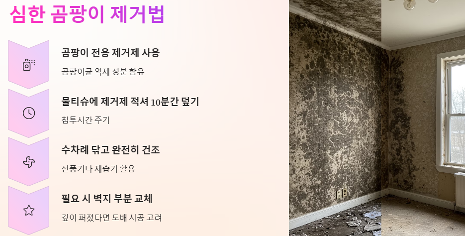 👉 TIP: 표면만 지우면 다시 번질 수 있으니, 벽 속까지 침투된 곰팡이는 반복적으로 제거해줘야 해요!