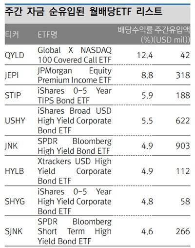 이 표는 다양한 월배당 ETF의 배당 수익률을 보여주고 있어요. 수익률이 높은 ETF를 선택하는 것이 좋겠지만, 투자 전 리스크와 수익성을 함께 고려해야 해요. 높은 수익률이 항상 안전한 것은 아니니까요.