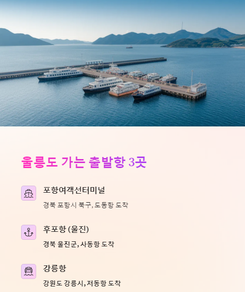 울릉도로 가는 배는 경북 동해안 항구에서 출발해요.