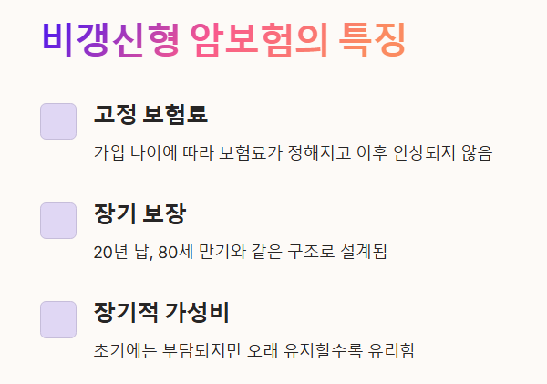 비갱신형 암보험은 보험료가 일정하고, 정해진 기간 동안 동일한 조건으로 보장받는 상품입니다.