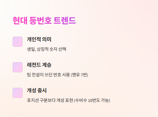 - ‘레전드 계승’ 등번호 사용: 팀의 전설이 쓰던 번호 사용 (ex. 맨유 7번)