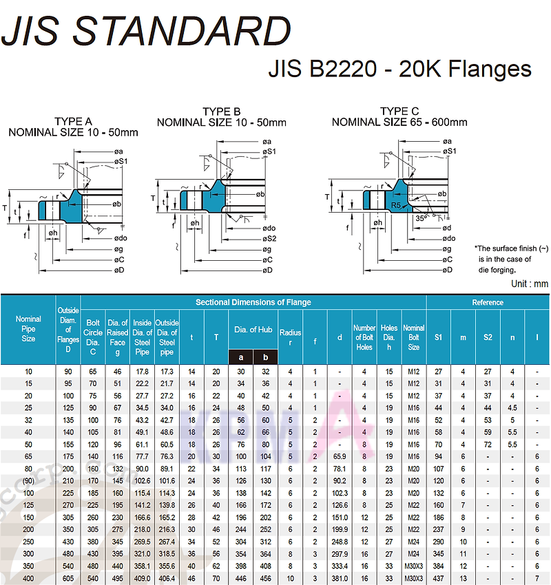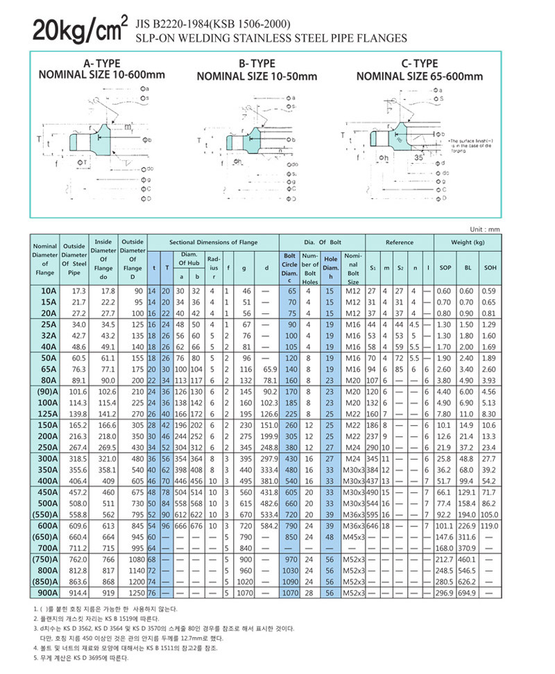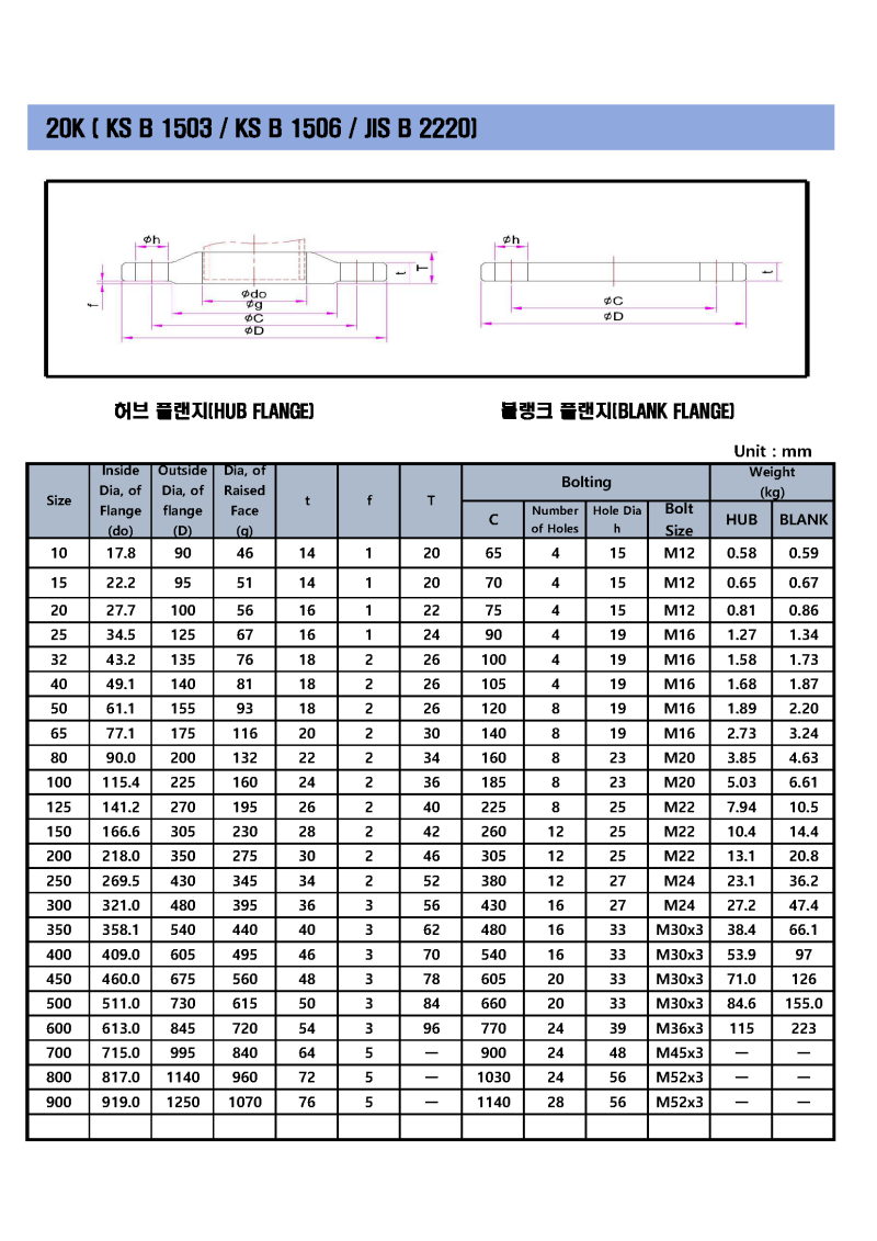 20K 플랜지는 다양한 규격으로 제공되며, JIS B2220 및 KS 규격에 따라 제작됩니다. 아래의 표는 20K 플랜지의 주요 규격을 정리한 것입니다.