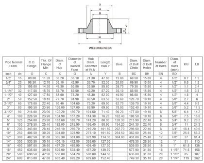 150LB 플랜지의 규격은 ANSI B16.5에 따라 정해져 있습니다. 다양한 크기와 형태에 따라 외경, 두께, 볼트 구멍의 직경 등이 다르게 설정됩니다. 예를 들어, 1/2인치에서 30인치까지 다양한 사이즈가 있으며, 각 사이즈에 대한 상세한 규격은 다음과 같습니다.