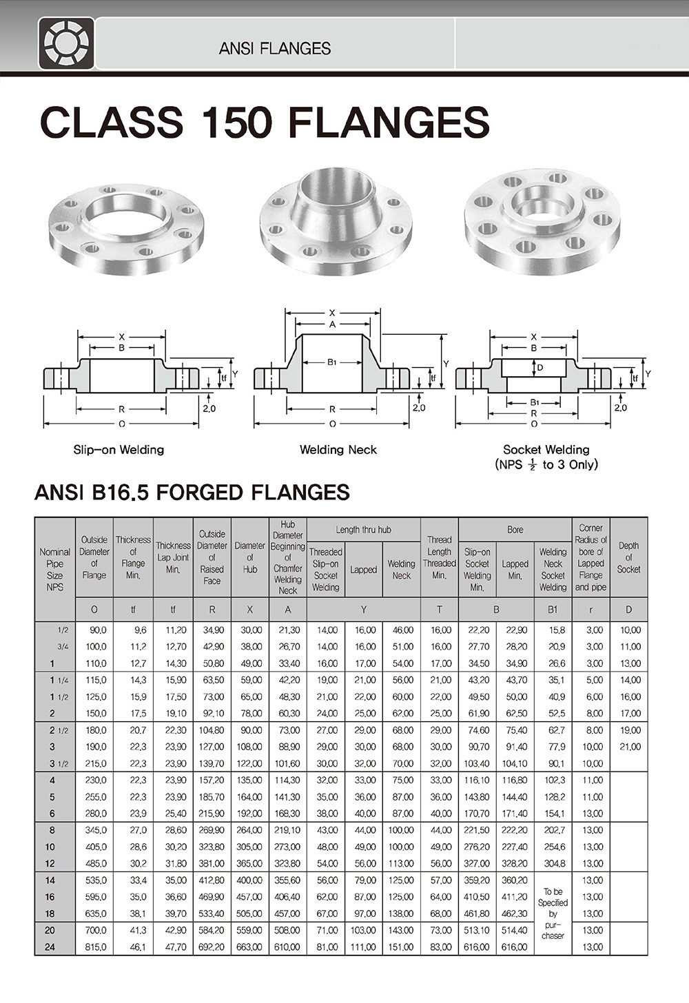 150LB 플랜지의 규격은 ANSI B16.5에 따라 정해져 있습니다. 다양한 크기와 형태에 따라 외경, 두께, 볼트 구멍의 직경 등이 다르게 설정됩니다. 예를 들어, 1/2인치에서 30인치까지 다양한 사이즈가 있으며, 각 사이즈에 대한 상세한 규격은 다음과 같습니다.